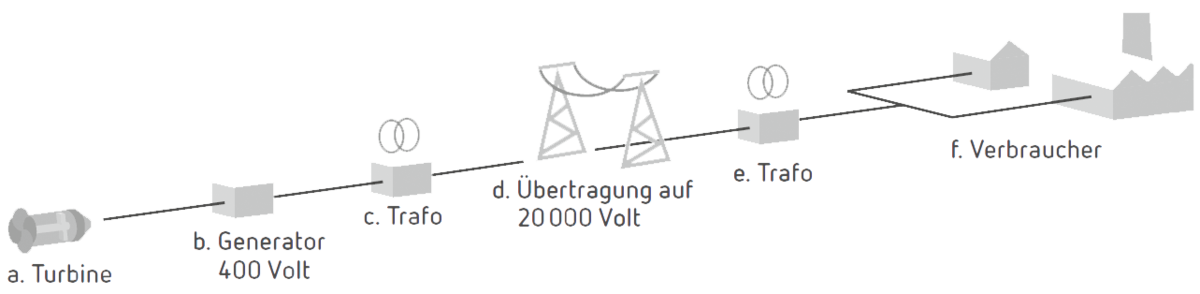 e. In der Nähe der Verbraucher wird die elektrische Spannung durch einen Transformator von 20 000 Volt auf 400 Volt reduziert.