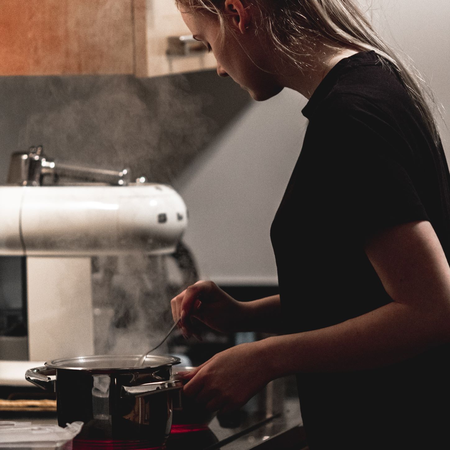 Der Dunstabzug ist effizient, um Gerüche beim Kochen zu verringern. Gibt es viel Dampf, dann sollte der Abzug kurz und intensiv laufen. Bei weniger Dampf reicht der Betrieb auf der niedrigsten Stufe und nur solange auch gekocht wird.
