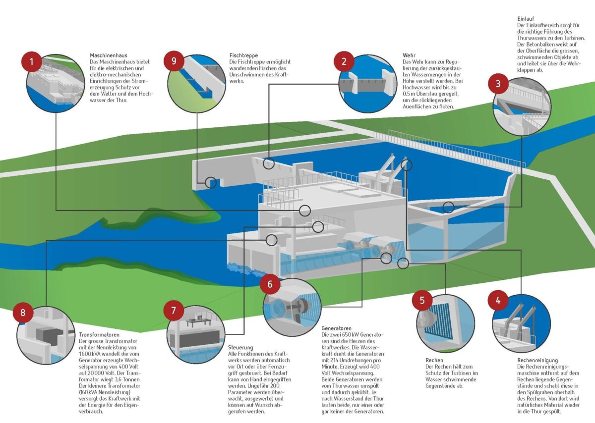 a. Die Kraft des abfliessenden Wassers der Thur dreht die Turbinenräder.